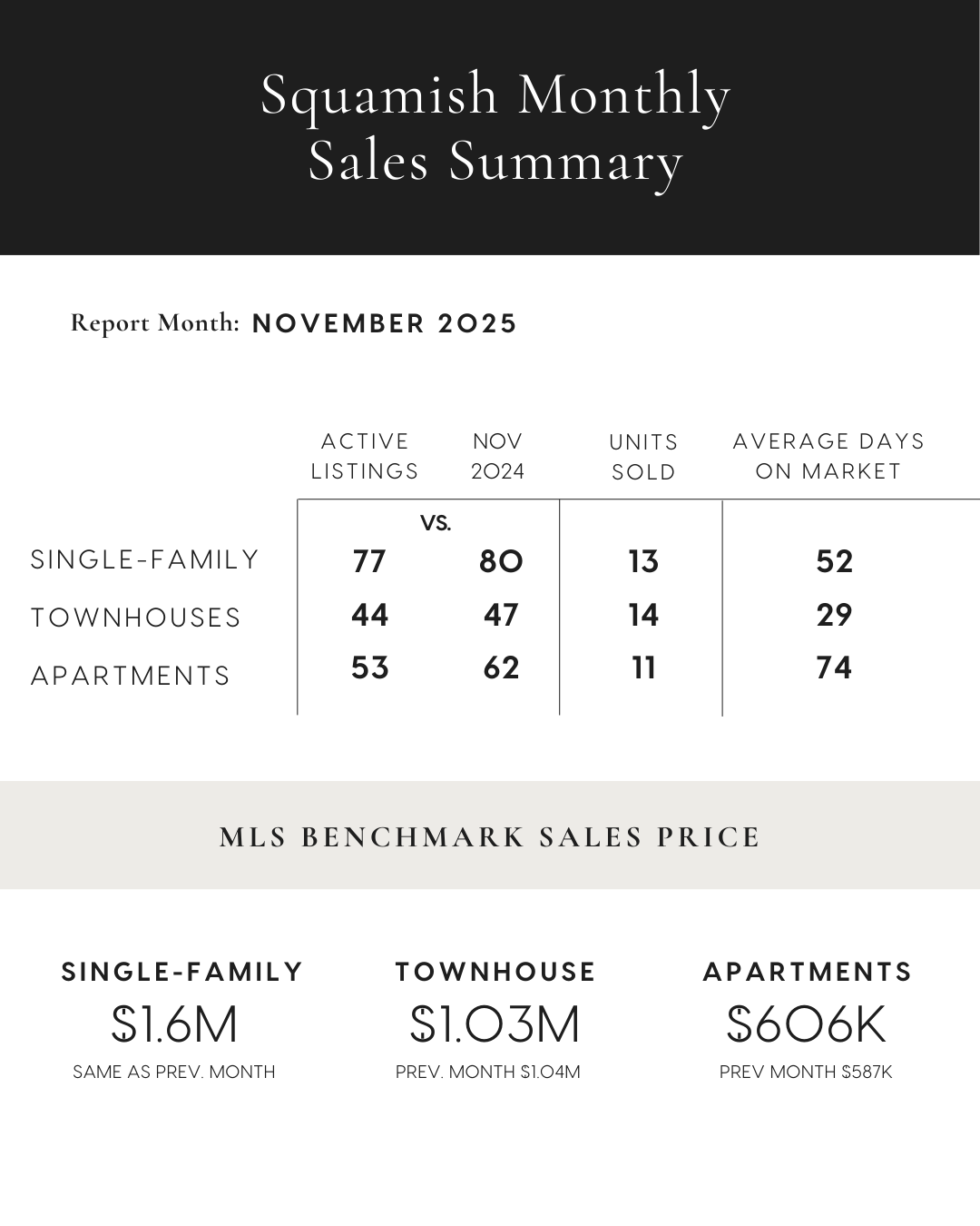 After a busy October with an above-average surge in new listings, the Squamish market slowed back to normal in November.